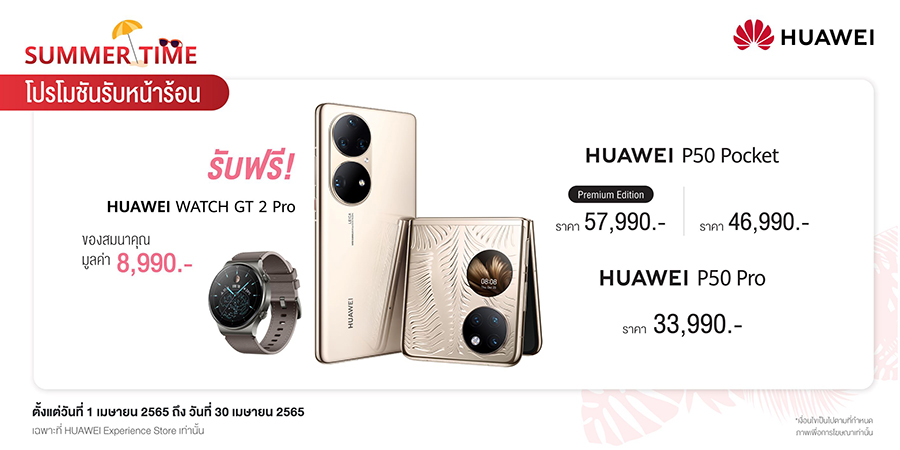 เริ่มรุ่นแรกกับสมาร์ทโฟนเรือธงสองรุ่นที่เขย่าตลาดสมาร์ทโฟนกล้องโปรตั้งแต่ต้นปี 2565 ทั้ง HUAWEI P50 Pocket และ HUAWEI P50 Pro ที่โดดเด่นด้วยดีไซน์กล้องวงแหวนคู่อันเป็นเอกลักษณ์ โดย HUAWEI P50 Pocket สมาร์ทโฟนจอพับดีไซน์ 3 มิติ ที่ผสานความงามของแฟชั่นและความอัจฉริยะของเทคโนโลยีไว้ด้วยกันอย่างลงตัว ที่สุดแห่งการพับจอแบบเรียบเนียนสนิท มาพร้อมระบบกล้องจัดเต็ม Ultra Spectrum Camera Matrix เซลฟี่คมชัดด้วยกล้องหลักความละเอียดสูงสุด 40MP พร้อมระบบความปลอดภัยแบบ Super Privacy ปิดการใช้งานกล้อง ไมโครโฟนและโลเคชันอัตโนมัติเมื่อพับเครื่อง มีให้เลือก 2 สี คือ รุ่น Premium Edition สี Premium Gold ราคา 57,990 บาท และ สี White ราคา 46,990 บาท และ HUAWEI P50 Pro มาพร้อมการปฎิวัติวงการถ่ายภาพสุดล้ำกับกล้อง 4 ตัวที่พัฒนาร่วมกับ Leica กล้องหลัก 50MP True-Chroma Camera (Color) และกล้อง 40MP True-Chroma Camera (Monochrome) กล้อง 64MP Telephoto และ กล้อง 13MP Ultra-Wide Angle Camera เก็บภาพระดับโปรได้สวยทุกมิติ มาในสี Cocoa Gold และ Black ราคา 33,990 บาท เมื่อซื้อสมาร์ทโฟนเรือธงทั้งสองรุ่นนี้ที่ HUAWEI Experience Store เท่านั้น รับฟรี! HUAWEI WATCH GT 2 Pro มูลค่า 8,990 บาท