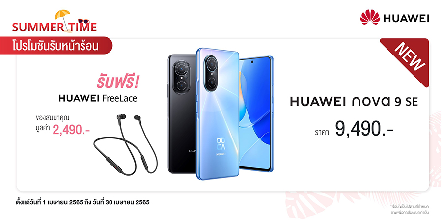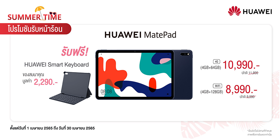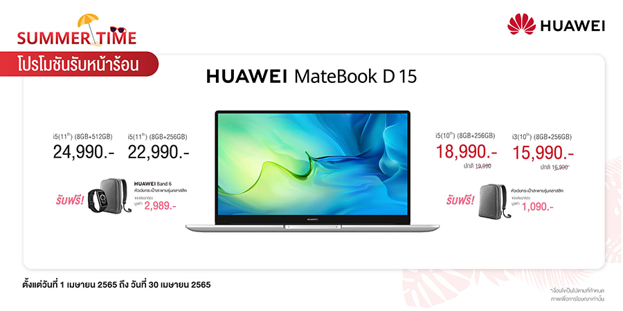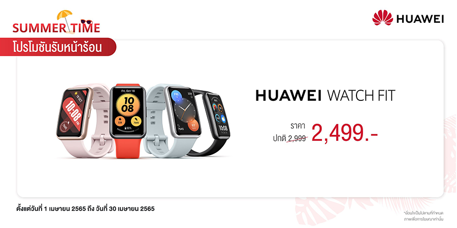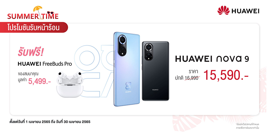 หัวเว่ย คอนซูมเมอร์ บิสสิเนส กรุ๊ป (ประเทศไทย) ยกขบวนดีไวซ์ตั้งแต่รุ่นใหม่ล่าสุดไปจนรุ่นสุดฮอต ทั้งสมาร์ทโฟน แล็ปท็อป แท็บเล็ต และ สมาร์ทวอทช์ พร้อมเสิร์ฟกับ "Summer Time" โปรโมชันรับหน้าร้อน ให้ทั้งสายเที่ยว สายเรียน สายทำงาน สายบันเทิง และสายสุขภาพให้เลือกซื้อได้อย่างจุใจ ทั้งลดราคาและของแถมสุดพิเศษให้ไปใช้เข้าชุดกันให้ครบครันเต็มประสิทธิภาพ พร้อมแล้วให้พุ่งตัวไปซื้อหาที่ HUAWEI Experience Store ทุกสาขา และ ร้านค้าตัวแทนจำหน่ายที่ร่วมรายการ ตั้งแต่วันที่ 1 - 30 เมษายน 2565