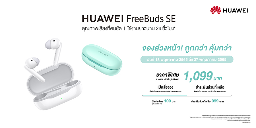 หัวเว่ย คอนซูมเมอร์ บิสสิเนส กรุ๊ป (ประเทศไทย) จัดโปรโมชันมอบดีลสุดพิเศษก่อนใคร เมื่อสั่งซื้อ HUAWEI FreeBuds SE หูฟังไร้สายแบบกึ่งอินเอียร์ใหม่ ฟังสบายต่อเนื่อง เชื่อมต่อง่ายทุกความรู้สึกในราคาสบายกระเป๋า ตั้งแต่ 18 - 27 พฤษภาคม 2565 โดยจำหน่ายเฉพาะช่องทางออนไลน์ HUAWEI Store และร้านค้าอย่างเป็นทางการของหัวเว่ยบน Shopee และ Lazada เท่านั้น รับทันทีส่วนลดพิเศษ เมื่อซื้อผ่านช่องทางดังต่อไปนี้