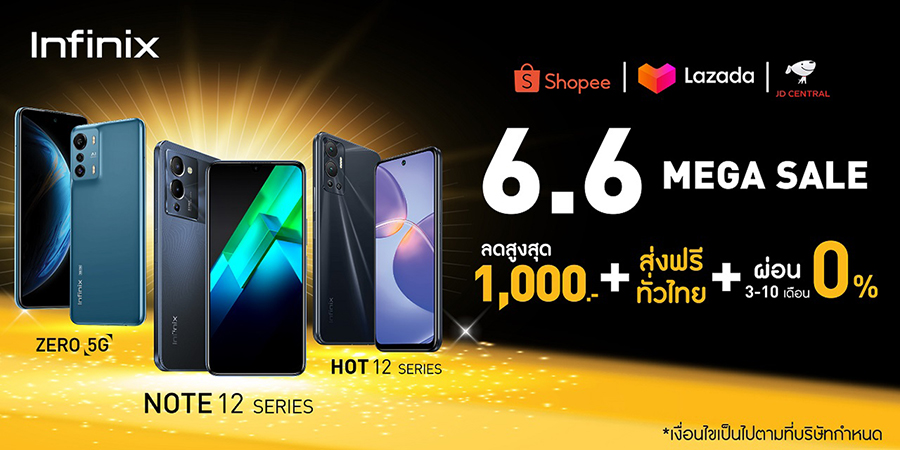 อินฟินิกซ์ (Infinix) แบรนด์ระดับโลกที่ได้รับความนิยมและกำลังเติบโตในตลาดอิเล็กทรอนิกส์ ต้อนรับมหกรรมช้อปปิ้งออนไลน์สุดยิ่งใหญ่กลางปี จัดเต็มโปรดีช่วงเวลา Flash Sale ใน 6.6 Mega Sale กับกองทัพสมาร์ตโฟนรุ่นเด็ดยอดนิยม ได้แก่ รุ่น ZERO 5G, HOT 11 Series, HOT 12 Series, NOTE 10 Pro และ NOTE 12 Series ที่ลดราคากันแบบจุใจ ด้วยส่วนลดสูงสุดถึง 1,000 บาท พร้อมเสิร์ฟความคุ้มค่าด้วยสิทธิประโยชน์มากมาย ที่ให้ลูกค้าเป็นเจ้าของมือถือได้ในราคาที่ดีที่สุด พร้อมยังมอบดีลเด็ด ฟรีค่าจัดส่งเมื่อซื้อสินค้าที่ร่วมรายการ และผ่อน 0% สูงสุดนาน 10 เดือน โดยสามารถซื้อสินค้าได้ที่ร้าน Infinix Official Store บน Shopee, Lazada และ JD Central ระหว่างวันที่ 6 – 8 มิถุนายน 2565