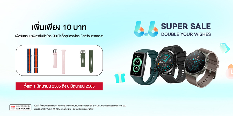 หัวเว่ย คอนซูมเมอร์ บิสสิเนส กรุ๊ป (ประเทศไทย) จัดมหกรรมแคมเปญชอปปิงออนไลน์สุดยิ่งใหญ่ต้อนรับกลางปี ส่งดีลปัง HUAWEI 6.6 Sales ยกทัพสมาร์ทดีไวซ์สุดล้ำหลากหลายกลุ่มผลิตภัณฑ์ไม่ว่าจะเป็นแท็บเล็ต สมาร์ทวอทช์ และจอมอนิเตอร์ มาให้เลือกจับจองเป็นเจ้าของในราคาลดพิเศษสูงสุดถึง 40% พร้อมยกกำลังความคุ้มค่า แค่จ่ายเพิ่มเพียง 10 บาท รับสายนาฬิกาเพิ่มไปเลย เมื่อซื้อสมาร์ทวอทช์รุ่นที่ร่วมรายการ จำกัดเวลาร่วมโปรเด็ดโดนใจแบบไม่กลัวฝนตั้งแต่วันที่ 1 มิถุนายน 2565 ถึงวันที่ 8 มิถุนายน 2565 เมื่อซื้อสินค้าผ่านช่องทาง HUAWEI Store และร้านค้าอย่างเป็นทางการของหัวเว่ยบนแอปพลิเคชัน Lazada และ Shopee เท่านั้น