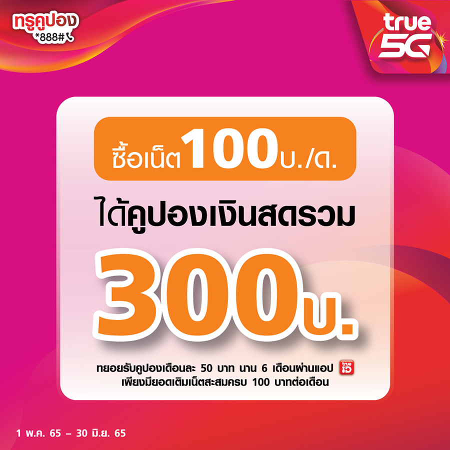 • ซื้อแพ็กเกจอินเทอร์เน็ตครั้งแรก 100 – 199 บาท รับคูปองเงินสดรวม 300 บาท (รับคูปองเดือนละ 50 บาท นาน 6 เดือน ผ่านแอปทรูไอดี เพียงมียอดเติมแพ็กเน็ตสะสมครบ 100 บาท/เดือน ทุกๆ เดือน นานต่อเนื่อง 6 เดือน)