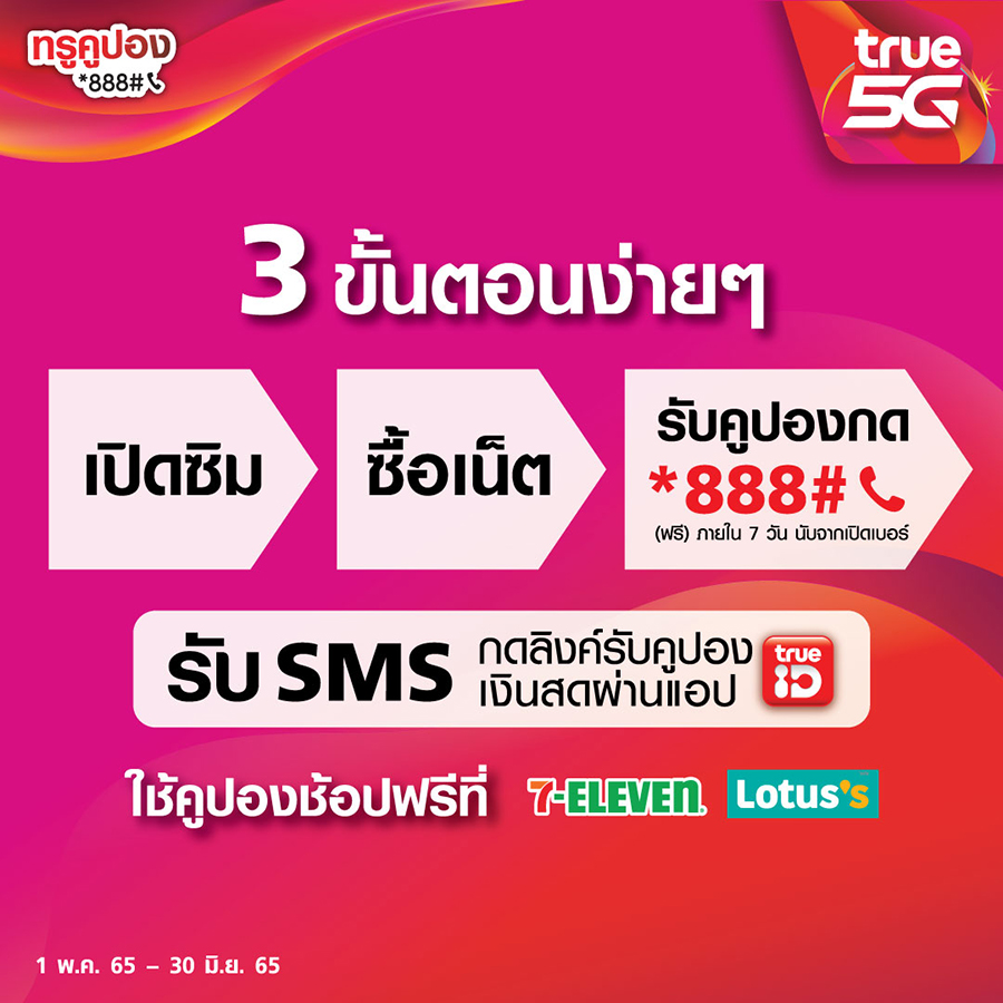 โอกาสสุดท้าย! "ทรูคูปอง ทรูคืนให้" เปิดซิมทรูวันนี้ รับคูปองเงินสด ช้อปฟรีที่ 7-11 และโลตัสทุกสาขา รับสิทธิ์กด *888# โทรออก