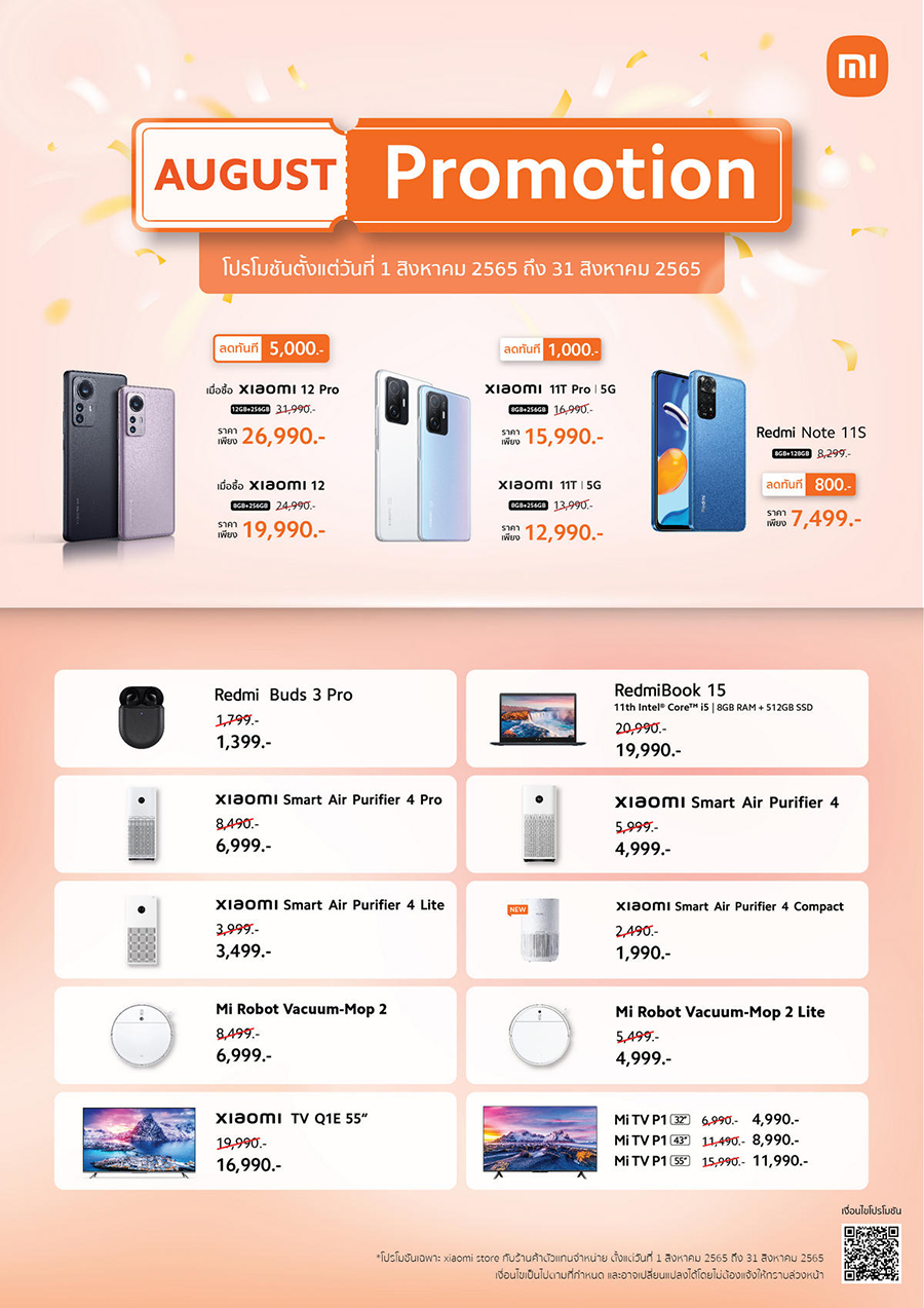 พบกับโปรโมชันพิเศษตลอดเดือนสิงหาคม ในระหว่างวันที่ 1 - 31 สิงหาคม 2565 ได้ที่ Xiaomi Store และร้านตัวแทนจำหน่ายที่ร่วมรายการทั่วประเทศ