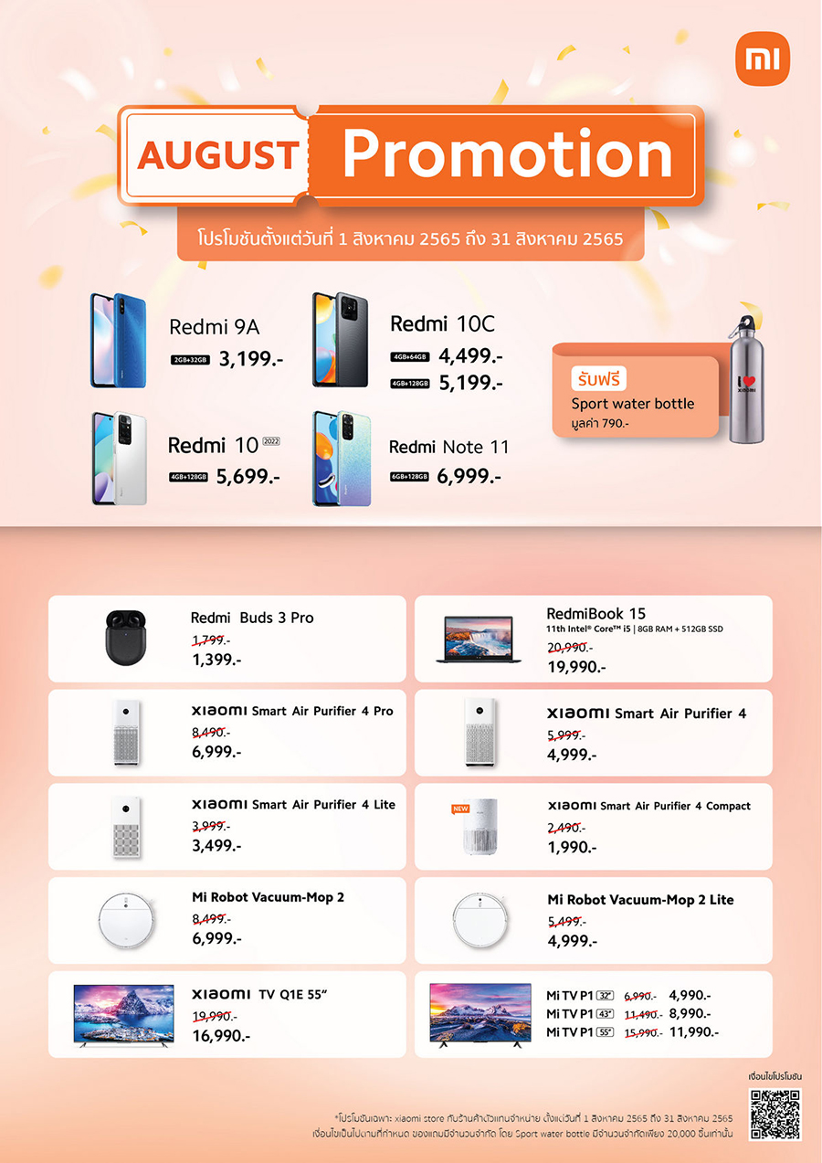 เสียวหมี่ ประเทศไทย จัดโปรโมชันพิเศษตลอดเดือนสิงหาคม ยกขบวนสมาร์ทโฟนและผลิตภัณฑ์ AIoT ลดราคาพิเศษ พร้อมรับของสมนาคุณสุดคิ้วท์ ในระหว่างวันที่ 1 - 31 สิงหาคม 2565 ที่ Xiaomi Store และร้านตัวแทนจำหน่ายที่ร่วมรายการทั่วประเทศ