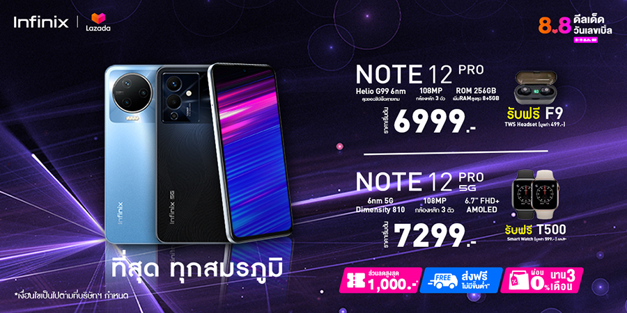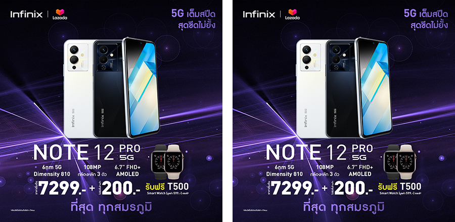 - NOTE 12 Pro 5G ลดราคาจากปกติ 8,299 บาท เหลือเพียง 7,299 บาท พร้อมรับฟรี Smart Watch T500 มูลค่า 599 บาท