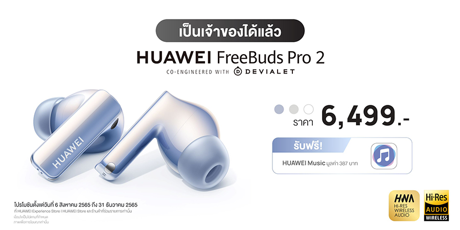 อย่าพลาด! HUAWEI FreeBuds Pro 2 วางจำหน่ายแล้วในไทยตั้งแต่ 6 สิงหาคม 2565 มีให้เลือกทั้ง สีฟ้า Silver Blue, สีเงิน Silver Frost และสีขาว Ceramic White ให้จับคู่กับสไตล์ของคุณแม่ เมื่อซื้อสินค้าผ่านหน้าร้าน HUAWEI Experience Store และร้านค้าที่ร่วมรายการ และช่องทางออนไลน์ HUAWEI Store และร้านค้าอย่างเป็นทางการของหัวเว่ยบน Shopee และ Lazada รับฟรี! HUAWEI Music Premium VIP ถึง 3 เดือน ให้ฟังเพลงกันไปแบบจัดเต็มไปเลย