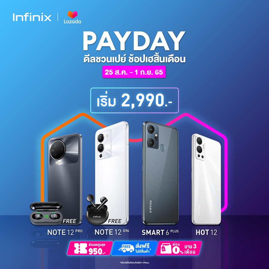 อินฟินิกซ์ (Infinix) แบรนด์ระดับโลกที่ได้รับความนิยมและกำลังเติบโตในตลาดอิเล็กทรอนิกส์ จัดโปรแรงส่งท้ายปลายเดือนกับช่วงเวลา Flash Sale ใน Lazada Payday ขนขบวนสมาร์ตโฟนหลากหลายรุ่นยอดนิยม อาทิ NOTE 12 G96 รุ่น 8GB + 256GB, NOTE 12 PRO, NOTE 12 PRO 5G, Smart 6 Plus, HOT 12 และ HOT 12 Play รุ่น 4GB + 64GB ที่ลดราคากันแบบจัดหนักด้วยส่วนลดสูงสุดถึง 950 บาท* ราคาเริ่มต้นเพียง 2,990 บาท พร้อมมอบความคุ้มค่าส่งฟรีไม่มีขั้นต่ำเมื่อซื้อสินค้าที่ร่วมรายการ และผ่อน 0% สูงสุดนาน 3 เดือน เพื่อให้ลูกค้าเป็นเจ้าของมือถือได้ในราคาที่ดีที่สุด โดยสามารถซื้อสินค้าได้ที่ร้าน Infinix Official Store บน Lazada ระหว่างวันที่ 25 สิงหาคม - 1 กันยายน 2565