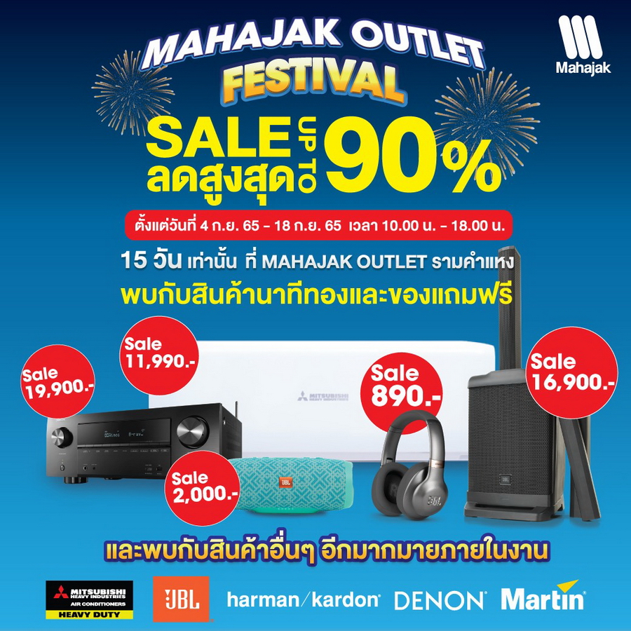 บริษัท มหาจักรดีเวลอปเมนท์ จำกัด จัดมหกรรมลดราคาครั้งใหญ่ Mahajak Outlet Festival ลดสูงสุด 90% จัดเต็มสินค้าแบรนด์ดังจากมหาจักรฯ ทั้งเครื่องปรับอากาศ Mitsubishi Heavy Duty, ลำโพงพกพา หูฟัง Lifestyle, เครื่องเสียงระดับมืออาชีพ Professional Audio, เครื่องเสียงบ้าน Home Audio, และเครื่องเสียงติดรถยนต์ JBL Car Audio สินค้านาทีทอง ลดราคาพิเศษจำนวนจำกัดต่อวัน และของแถมสุดพิเศษฟรี!! ที่ Mahajak Outlet รามคำแหง