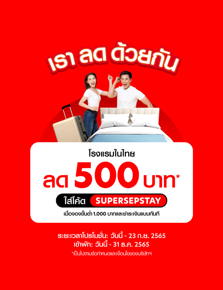 - ส่วนลดโรงแรม : สัมผัสประสบการณ์ใหม่ในการท่องเที่ยวช่วงปลายฝนต้นหนาว ด้วยการแจกส่วนลดโรงแรมที่พักในประเทศไทยมูลค่า 500 บาท (เมื่อมียอดจองขั้นต่ำ 1,000 บาท) เพียงใส่รหัส "SUPERSEPSTAY" รีบเลยดีลดีๆ สุดพิเศษที่สายเที่ยวต้องห้ามพลาดรออยู่ เฉพาะ 19 - 23 กันยายนนี้เท่านั้น จองเลยที่ airasia Super App