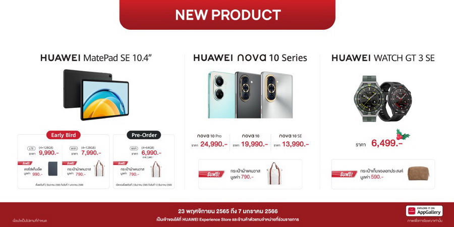 - HUAWEI MatePad SE 10.4 รุ่น WiFi (4+128GB) แท็บเล็ตจอถนอมสายตา คมชัดระดับ 2K พร้อมระบบเสียงรอบด้าน ราคาเพียง 7,990 บาท รับฟรี! กระเป๋าผ้าแคนวาส มูลค่า 790 บาท ส่วน HUAWEI MatePad SE 10.4 รุ่น LTE (4+128GB) ราคา 9,990 บาท รับฟรี! เคสใส่แท็บเล็ต มูลค่า 990 บาท เมื่อซื้อสินค้าที่หน้าร้าน HUAWEI Experience Store และร้านค้าอื่นๆ ที่ร่วมรายการ ตั้งแต่วันที่ 2 ธันวาคม 2565 ถึง 7 มกราคม 2566