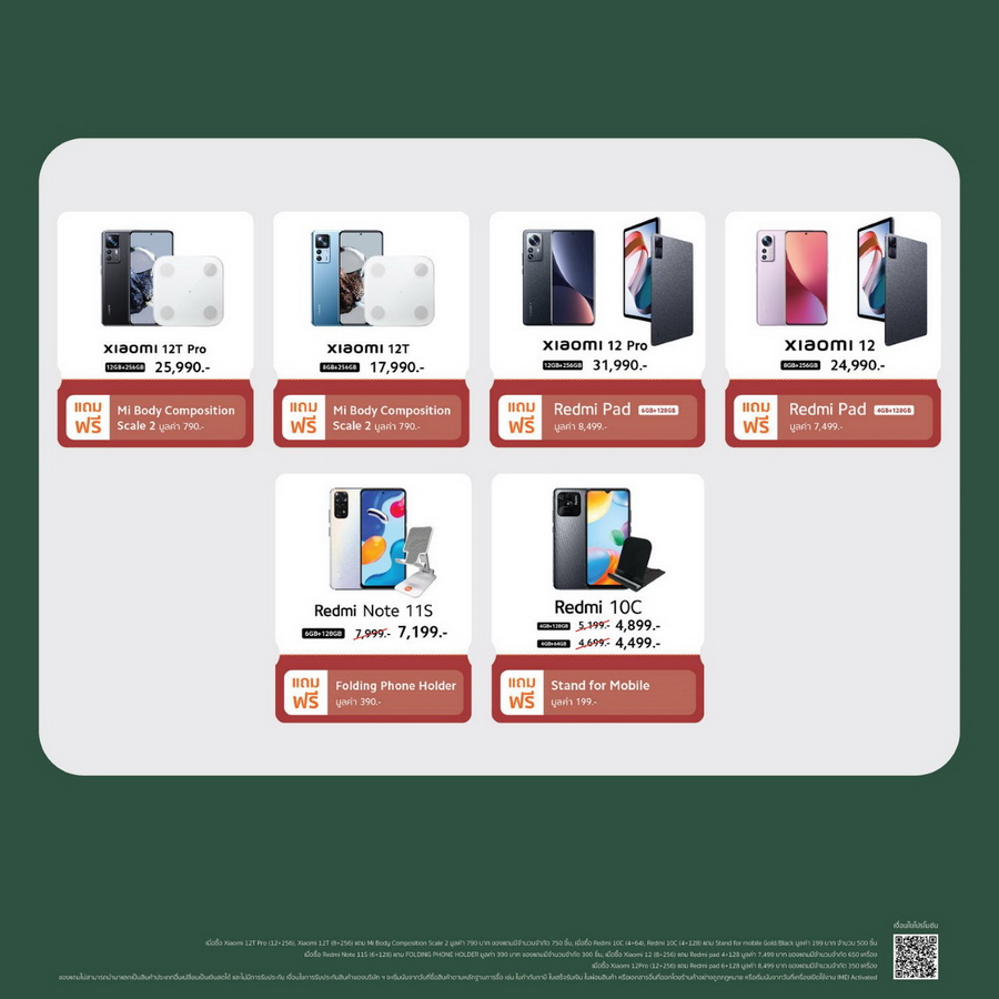 - เมื่อซื้อสมาร์ทโฟน Xiaomi 12 Pro รุ่นความจุ 12GB+256GB ราคา 31,990 บาท รับฟรี Redmi Pad รุ่นความจุ 6GB + 128GB มูลค่า 8,499 บาท* ที่ Xiaomi Store เท่านั้น
