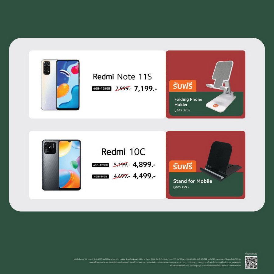 - เมื่อซื้อสมาร์ทโฟน Redmi Note 11S รุ่นความจุ 6GB+128GB ราคาพิเศษเพียง 7,199 บาท (จากราคาปกติ 7,999 บาท) พร้อมรับฟรี Folding Phone Holder มูลค่า 390 บาท* ที่ Xiaomi Store หรือ ร้านตัวแทนจำหน่ายที่ร่วมรายการทั่วประเทศ