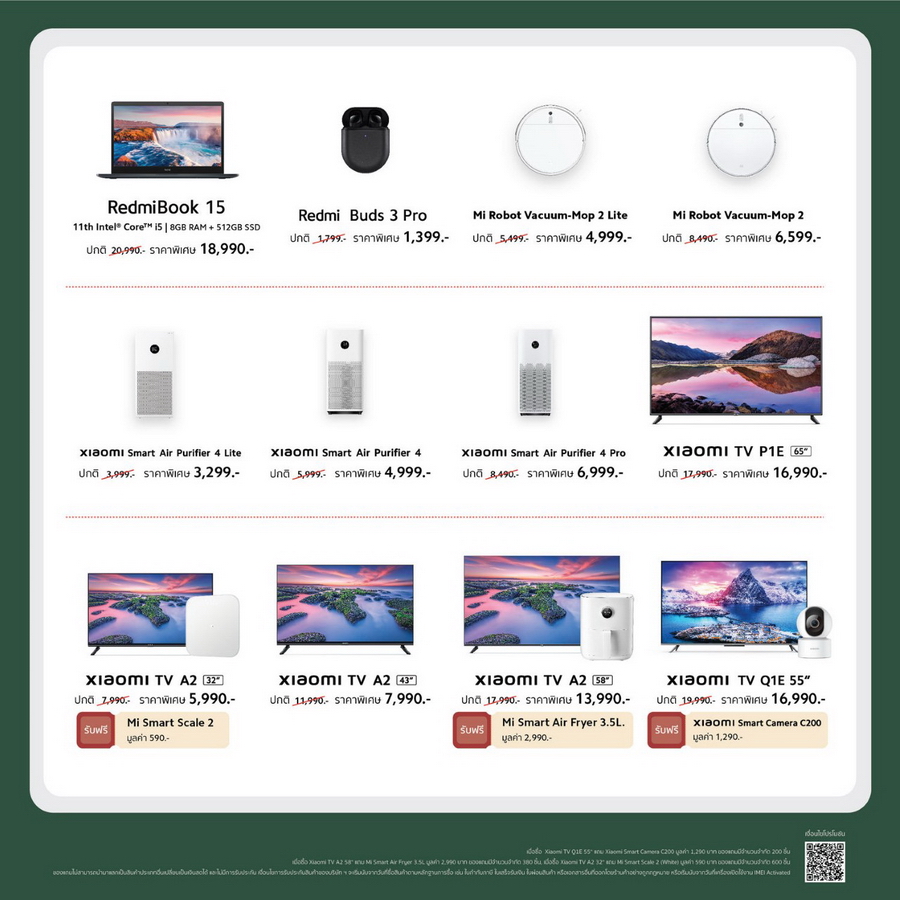 - สมาร์ททีวี Mi TV Q1E 55” ราคาพิเศษเพียง 16,990 บาท (จากราคาปกติ 19,990 บาท) พร้อมรับฟรี Mi Smart Camera C200 มูลค่า 1,290 บาท*