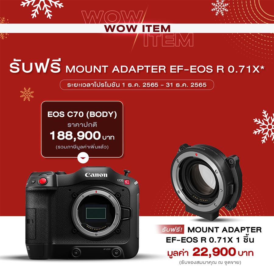 - ลูกค้าที่ซื้อกล้อง EOS C70 (เฉพาะตัวกล้อง) ราคาปกติ 188,900 บาท รับของสมนาคุณฟรีทันที Mount Adapter 0.71 มูลค่า 22,900 บาท จำนวน 1 ชิ้น ต่อการซื้อกล้อง 1 ตัว (รวมภาษีมูลค่าเพิ่มแล้ว)