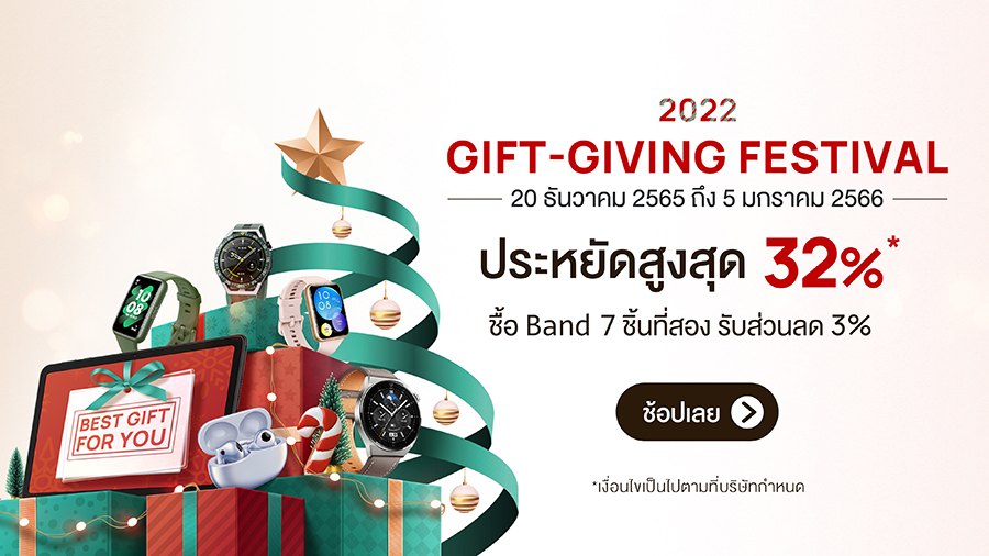 หัวเว่ย คอนซูมเมอร์ บิสสิเนส กรุ๊ป (ประเทศไทย) จัดแคมเปญออนไลน์ ดิลพิเศษ Gift-Giving Festival ขนขบวนสมาร์ทวอทช์ตอบโจทย์ทุกวัย ครอบคลุมทุกสายกิจกรรม เป็นไอเดียสำหรับใครที่กำลังมองหาของขวัญแทนความรักและความห่วงใยในเทศกาลปีใหม่ที่กำลังจะมาถึงนี้ พร้อมให้ซื้อหาง่ายในหลากหลายช่องทางออนไลน์ของหัวเว่ย ทั้ง HUAWEI Store ทางร้านค้าอย่างเป็นทางการของหัวเว่ยที่ Shopee และ Lazada ตั้งแต่วันที่ 20 ธันวาคม 2565 - 5 มกราคม 2566 นี้