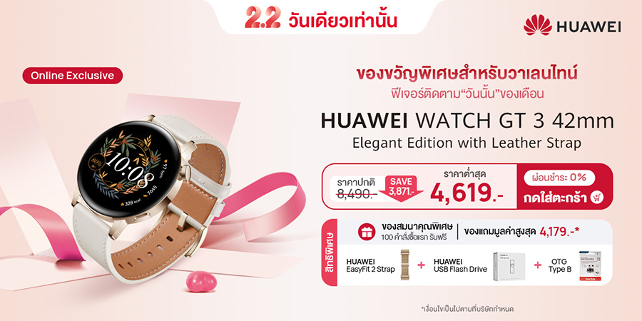 HUAWEI WATCH GT 3 Elegant Edition ขนาด 42 มม. มาพร้อมดีไซน์สายหนังสีขาวดูมีระดับเสริมลุคหรูให้สาวๆ แถมความเฮลตี้กับโหมดออกกำลังกายที่มีให้เลือกได้มากกว่า 100 โหมด รองรับการใช้งานยาวนานต่อเนื่องสูงสุด 7 วัน  กับราคาโปรโมชันลดสูงสุด 46% เหลือเพียง 4,619 บาท จากราคาปกติ 8,490 บาท แถมฟรีของสมนาคุณมูลค่าสูงสุด 4,179 บาท  นอกจากลดราคาจุใจแล้วยังแจกคูปองส่วนลด 100 บาท และผ่อนสบายๆ 0% นานสูงสุด 10 เดือน เมื่อซื้อสินค้าตั้งแต่วันที่ 2 - 15 กุมภาพันธ์ 2566 ที่ร้านค้าอย่างเป็นทางการของหัวเว่ยใน Shopee