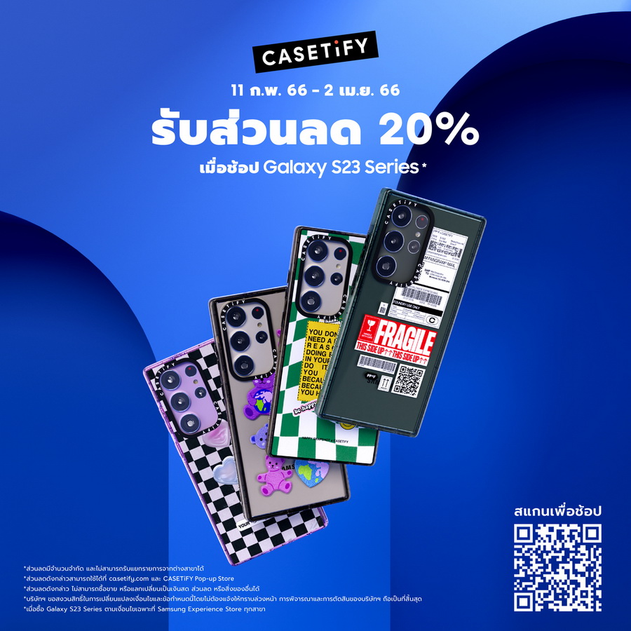 ครั้งแรกในประเทศไทย! ซัมซุงจับมือกับ CASETiFY แบรนด์เคสสมาร์ทโฟนสำหรับวัยรุ่น Gen Z มอบส่วนลด 20% ให้กับลูกค้าทุกคนที่ซื้อสมาร์ทโฟน Galaxy S23 Series ผ่าน Samsung Experience Store ภายใต้เงื่อนไขที่กำหนด โดยสามารถใช้ส่วนลดเพื่อซื้อเคสได้ ผ่าน casetify.com และ CASETiFY Pop-up Store เซ็นทรัลเวิลด์ ชั้น 1 โซน Atrium ตั้งแต่วันที่ 11 กุมภาพันธ์ – 31 มีนาคม 2566 นี้เท่านั้น