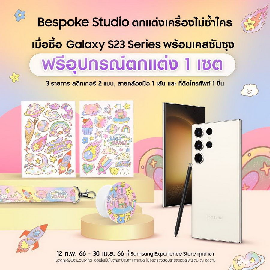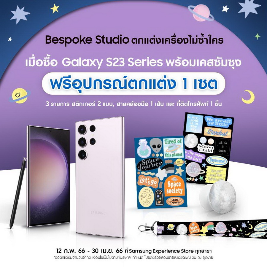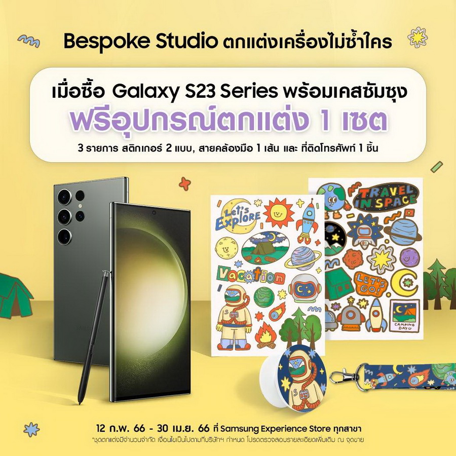 พี๊คคค! อีก เมื่อซื้อ Galaxy S23 Series พร้อมเคสซัมซุง ผ่าน Samsung Experience Store ตั้งแต่วันที่ 12 กุมภาพันธ์ – 30 เมษายน 2566 รับฟรี! อุปกรณ์ตกแต่งสุดคิ้วท์ 1 เซ็ตทั้งหมด 3 รายการ ประกอบไปด้วย สติกเกอร์ 2 ลาย สายคล้องมือ 1 เส้น และ Griptok 1 ชิ้น