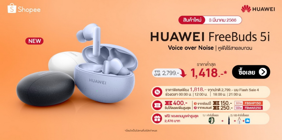 • HUAWEI FreeBuds 5i ราคาพิเศษเพียง 1,818 บาท จากปกติ 2,799 บาท บน Flash Sale 4 ช่วงเวลา 00:00 น.  12:00 น. 18:00 น. และ 21:00 น. ที่ร้านค้าอย่างเป็นทางการของหัวเว่ยบน Shopee
