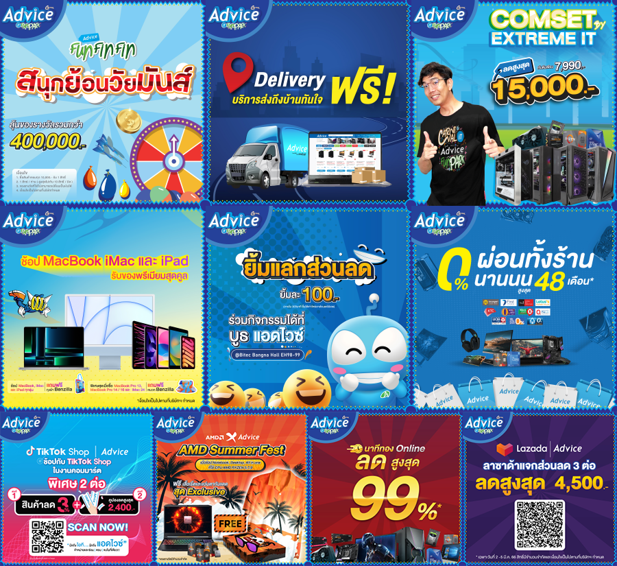นอกจากโปรโมชั่นสินค้าราคาพิเศษและกิจกรรมสนุก ๆ ภายในงานคอมมาร์ตแล้ว ลูกค้าที่ไม่สะดวกมาที่งานยังสามารถเลือกซื้อสินค้าผ่านช่องทางออนไลน์ในราคาเดียวกับในงานคอมมาร์ตได้เช่นกันกับ Advice IT EXPO ที่เราตั้งใจทำเสิร์ฟให้กับลูกค้าที่อยู่ต่างจังหวัดให้สามารถช้อปสินค้าไอทีเหมือนได้มางานคอมมาร์ต”