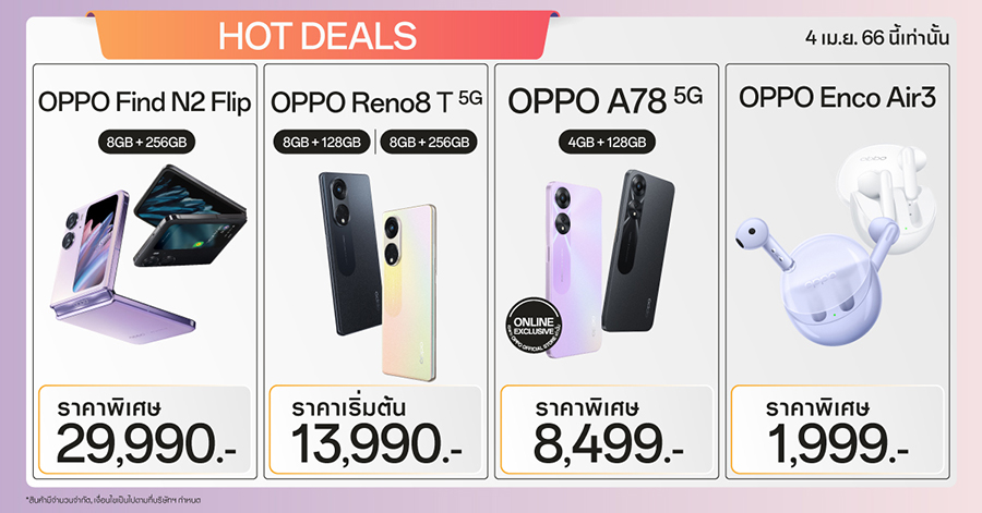 - OPPO A78 5G (4+128GB) พิเศษทางช่องทาง Online Exclusive ราคาเพียง 8,299 บาท ที่ Shopee และราคาเพียง 8,499 บาท ที่ Lazada จากราคาปกติ 8,499 บาท
