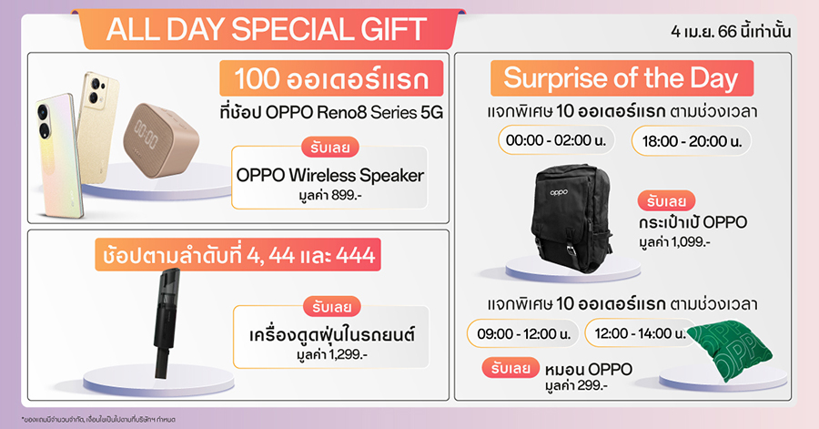Surprise of the Day ของแถมแจกพิเศษตามช่วงเวลา วันที่ 4 เมษายน 2566 เฉพาะที่ OPPO Official Store บน Shopee / Lazada เท่านั้น