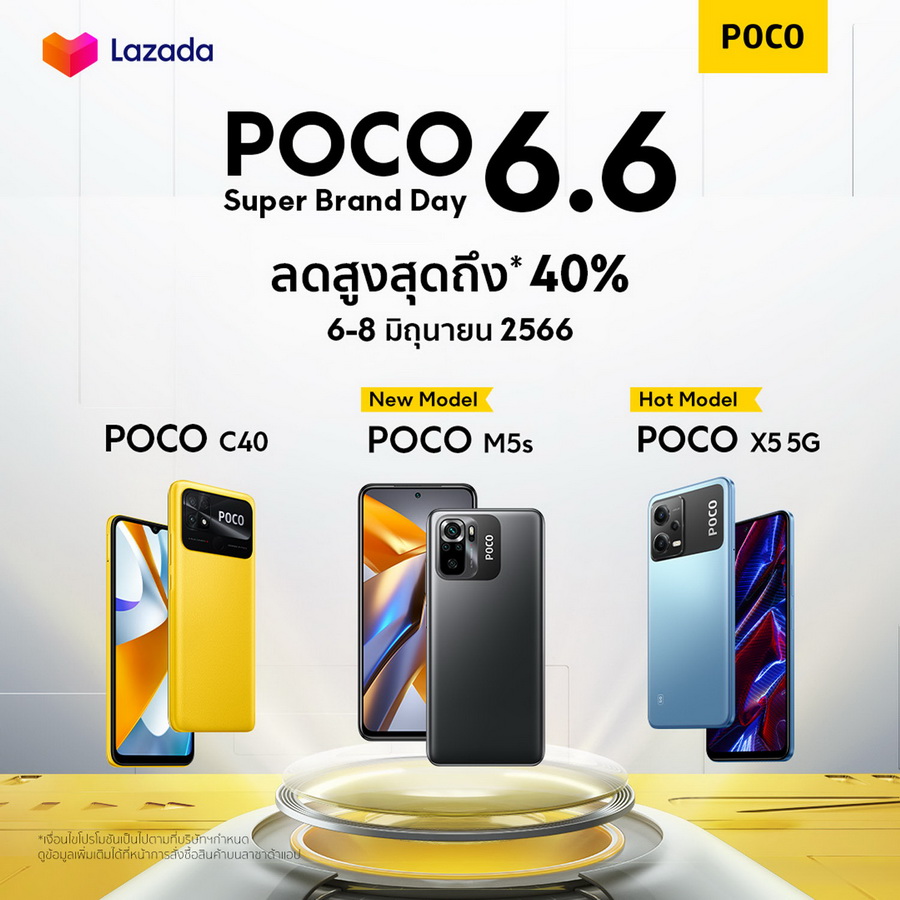 • สมาร์ทโฟน POCO อื่นๆมากมาย นำขบวนโดย POCO F5 Series และ POCO C40 มอบโปรโมชันพิเศษ* บน Shopee ในระหว่าวันที่ 6-7 มิถุนายน 2566 และ บน Lazada ในระหว่างวันที่ 6-8 มิถุนายน 2566