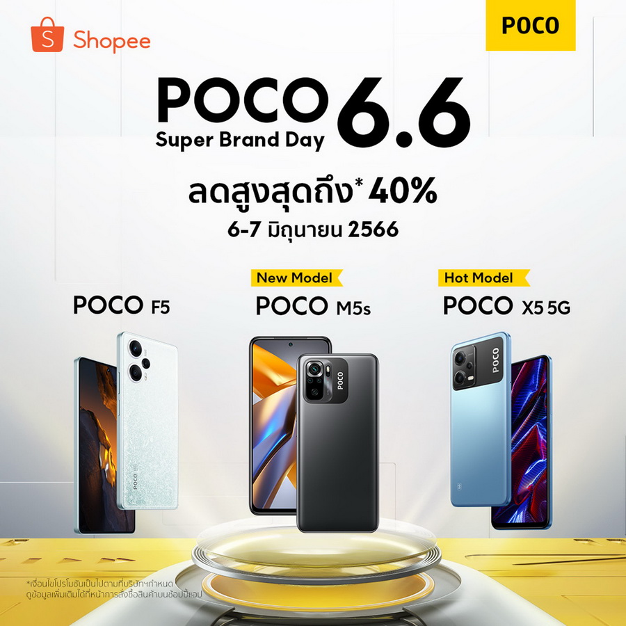 POCO ประเทศไทย ต้อนรับเทศกาลช้อปปิ้ง 6.6 จัดแคมเปญ POCO Super Brand Day มอบโปรโมชันพิเศษ* สำหรับสมาร์ทโฟน POCO มากมาย พร้อมประกาศวางจำหน่าย POCO M5s อย่างเป็นทางการในประเทศไทยบนช่องทางจำหน่าย Shopee และ Lazada ตั้งแต่วันที่ 6 มิถุนายนนี้