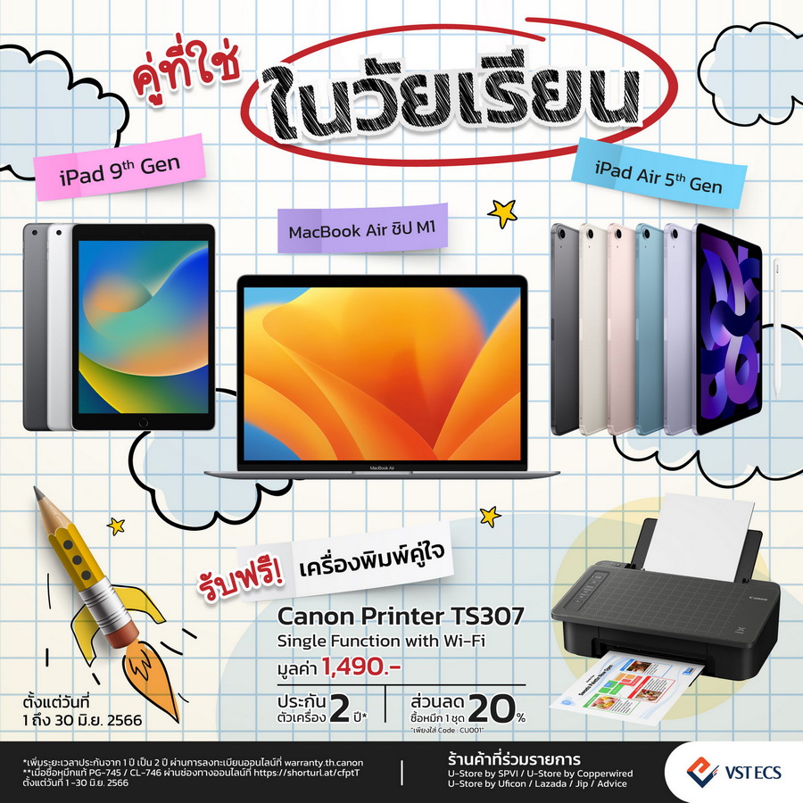 บริษัท วีเอสที อีซีเอส (ประเทศไทย) จำกัด ในเครือของวีเอสที อีซีเอส กรุ๊ป ผู้นำด้านการจัดจำหน่ายสินค้าไอทีในภูมิภาคเอเชียแปซิฟิค ร่วมกับ บริษัท แคนนอน มาร์เก็ตติ้ง (ไทยแลนด์) จำกัด จัดโปรโมชันสุดร้อนแรงต้อนรับเปิดเทอม “Back to School” เอาใจนักเรียนนักศึกษา เมื่อซื้อ iPad 9th Gen, iPad Air 5th Gen หรือ MacBook Air M1 ผ่าน SPVI, Copperwired, Uficon, Advice, J.I.B และ Lazada รับฟรี! พรินเตอร์ Canon PIXMA TS307 มูลค่า 1,490 บาท พร้อมรับประกันตัวเครื่องเพิ่มอีก 1 ปี เป็น 2 ปี และรับส่วนลด 20% ในการซื้อหมึกพิมพ์เพิ่ม 1 ชุด (ราคาปกติ 1,479 บาท) ระหว่างวันที่ 1-30 มิถุนายน 2566