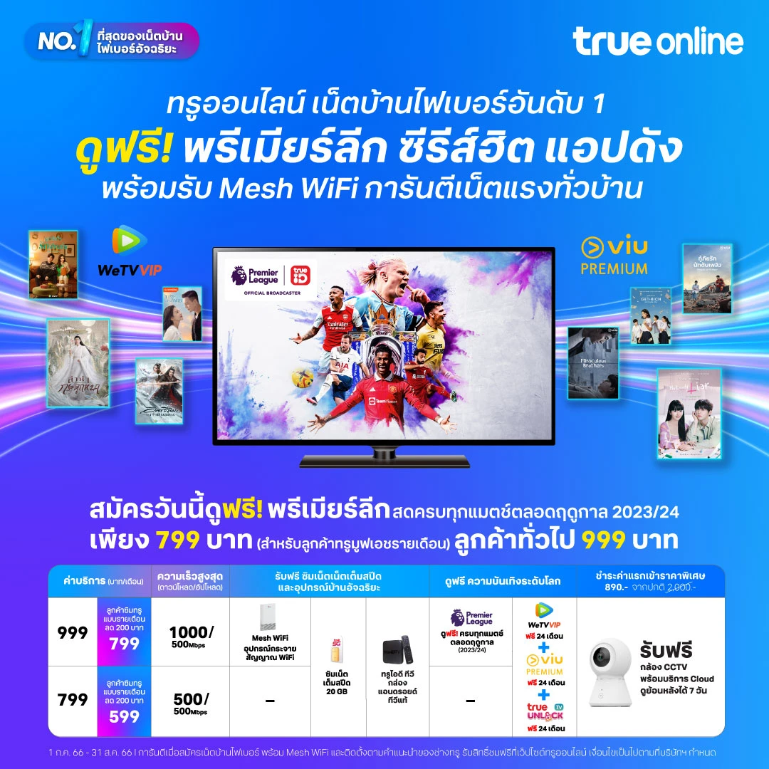 ทรูออนไลน์ เน็ตบ้านไฟเบอร์อันดับ 1 ชวนสมัครเน็ตบ้านไฟเบอร์ ความเร็ว 1Gbps / 500Mbps ลูกค้าทั่วไป 999 บาท เฉพาะลูกค้าทรูมูฟ เอช แบบรายเดือน จ่ายเพียง 799 บาท รับสิทธิพิเศษ ดังนี้