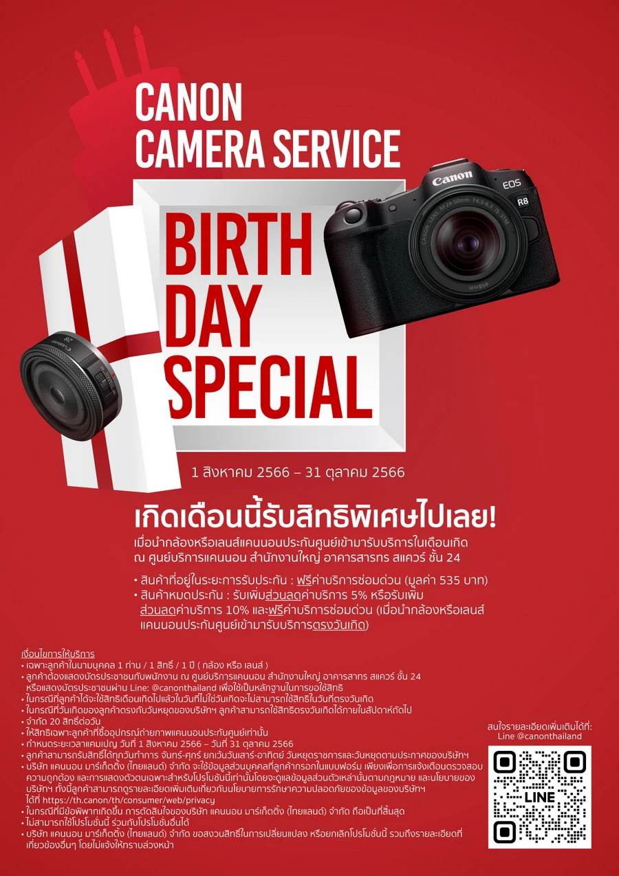 บริษัท แคนนอน มาร์เก็ตติ้ง (ไทยแลนด์) จำกัด (Canon) เดินหน้าจัด โปรโมชันพิเศษเอาใจช่างภาพ ล่าสุดเปิดบริการ Canon Camera Service Birthday Special มอบของขวัญ สุดเซอร์ไพรส์เพื่อฉลองเดือนเกิดของลูกค้าเจ้าของกล้องและเลนส์แคนนอน เพียงนำกล้องหรือเลนส์แคนนอนประกันศูนย์เข้ามารับบริการซ่อมในเดือนเกิดหรือตรงวันเกิดตลอดระยะเวลาของแคมเปญตั้งแต่วันที่ 1 สิงหาคม – 31 ตุลาคม 2566 ณ ศูนย์บริการแคนนอน สำนักงานใหญ่ (อาคารสาทรสแควร์ กรุงเทพฯ) ก็รับสิทธิประโยชน์สุดคุ้มค่า ดังนี้