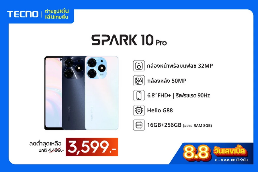 ♦SPARK 10 Pro ลดต่ำสุดเหลือ 3,599 บาท (จากราคา 4,499 บาท)