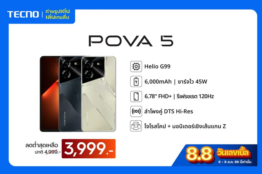 ♦ POVA 5 ลดต่ำสุดเหลือ 3,999 บาท (จากราคา 4,999 บาท)