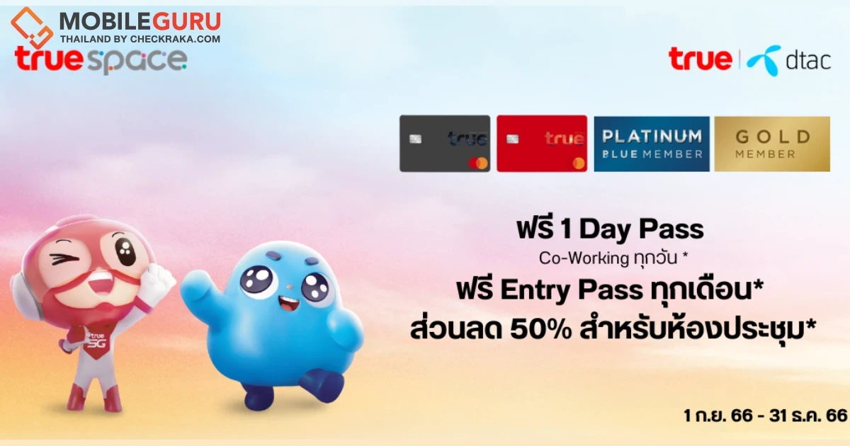 • ใช้ 299 ทรูพอยท์ หรือ 1499 Dtac coin แลก Package 3 Day Pass (มูลค่า 750.-) เมื่อเข้าใช้ Co-Working Space @True Space (จำกัด 1 สิทธิ์ / ท่าน / เดือน)