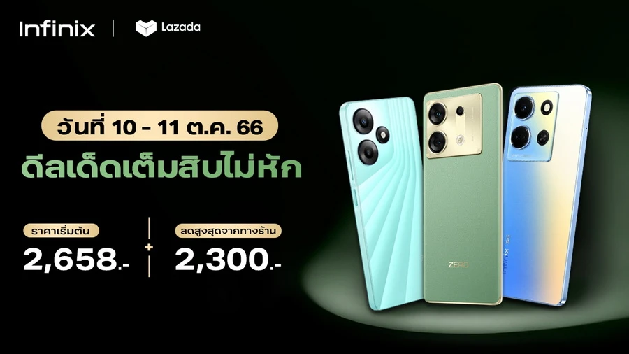 - 2. เมื่อซื้อสินค้าบน LAZADA ระหว่างวันที่ 10 - 11 ตุลาคม 2566 รับสิทธิ์ซื้อมือถือราคาพิเศษ ด้วยส่วนลดสูงสุดจากทางร้าน 2,300 บาท* ในช่วงเวลา Flash sale พร้อมโค้ดส่วนลดสูงสุดจากทาง Infinix 500 บาท และ โค้ดส่วนลดสูงสุดจากทาง Lazada 500 บาท โดยมีสินค้าที่ร่วมรายการ อาทิ