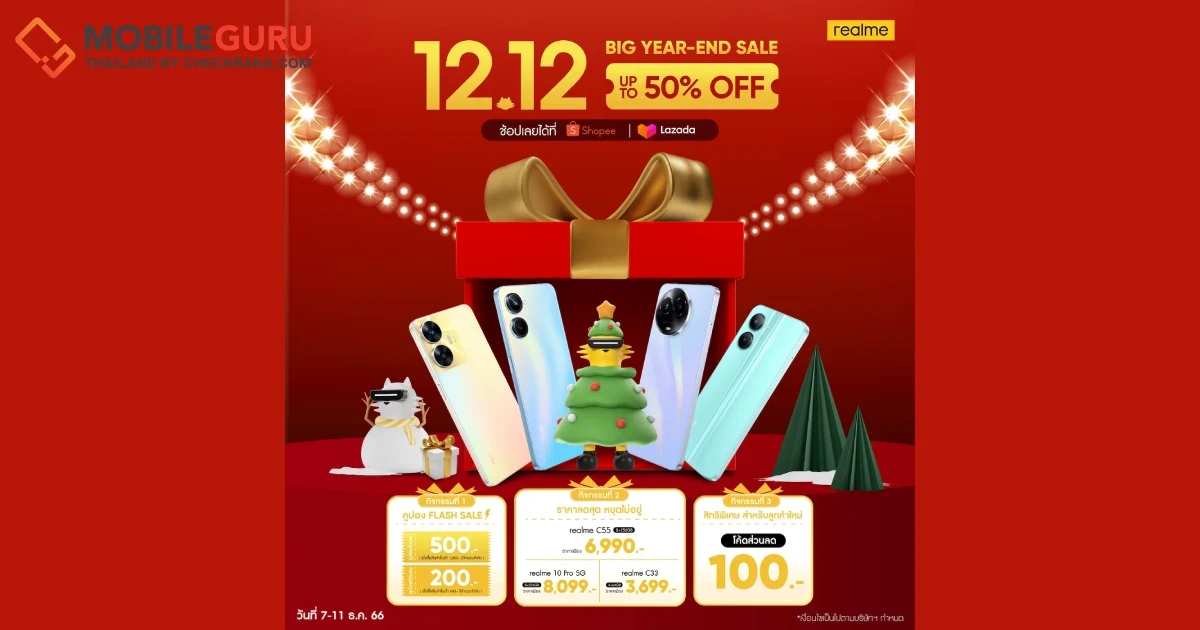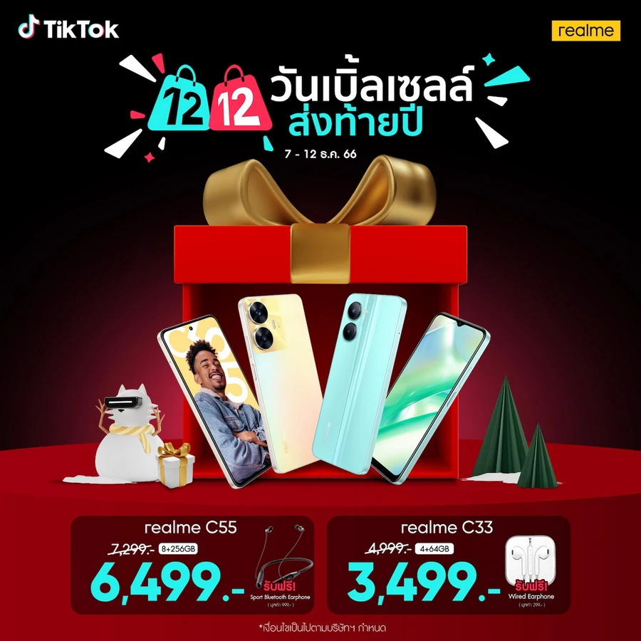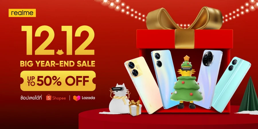 realme จัดมหกรรมลดใหญ่ส่งท้ายปี 12.12 ไปกับ realme deals real Joy ทั้งกิจกรรมเก็บคูปองส่วนลดสุดคุ้ม ช็อปสนุกกับสินค้า Flash Sale ราคาประหยัด ช็อปปั๊บรับของรางวัลพรีเมียม และอีกมากมาย ผ่านแพลตฟอร์มออนไลน์ชั้นนำทั้ง Tiktok realme official, Lazada realme flagship store และ Shopee realme official store ให้คุณเลือกช้อปแชมเปี้ยนสมาร์ตโฟนของเซกเมนต์ได้อย่างคุ้มค่าทั้ง realme C33, realme C51 และ realme C55 รวมถึงมือถือสเปกเทียบเคียงเรือธงอย่าง realme 10 Pro กับส่วนลดสูงสุด 50% หรือ 2,000 บาท! ตั้งแต่วันที่ 7-14 ธันวาคม 2566