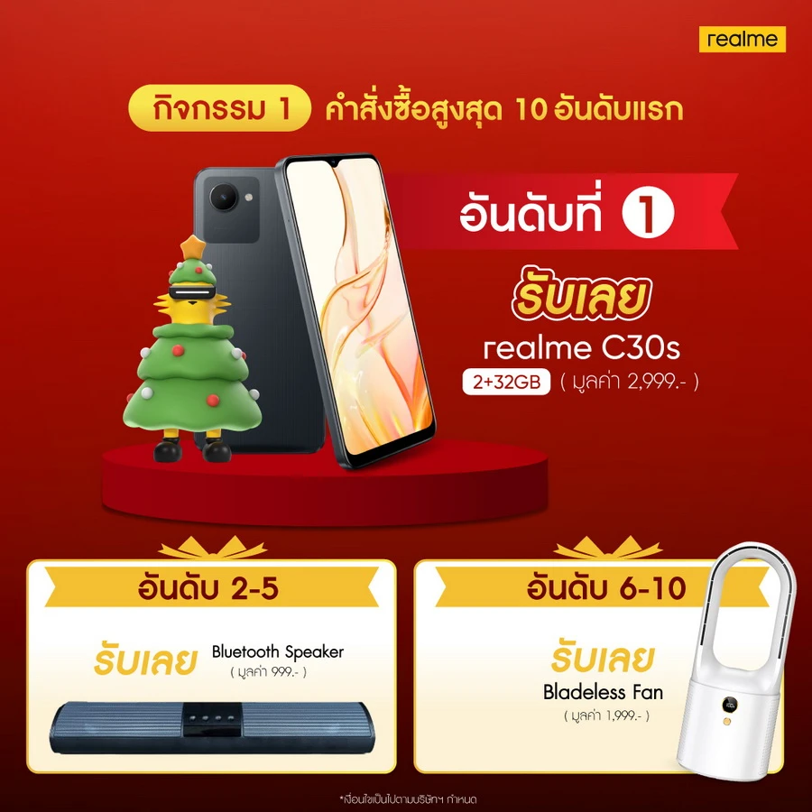 - กิจกรรมช้อปปั๊บรับรางวัล สำหรับลูกค้าที่มียอดสั่งซื้อสูงสุด 10 อันดับ รับฟรีของรางวัลมากมาย ทั้งสมาร์ตโฟน realme C30s, ลำโพงบลูทูธ และพัดลมไร้ใบพัด