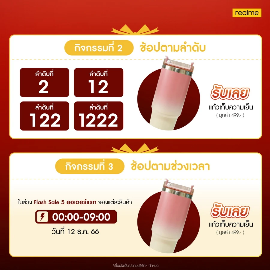 - กิจกรรมตอบแทนลูกค้า realme เพียงเขียนแชร์ความรู้สึกดี ๆ ลงในรีวิวเพจ พร้อมแนบรูปที่สั่งซื้อสมาร์ตโฟนในช่วง 12.12 แคปหน้าจอส่งไปที่ realme Official ของ Shopee หรือ Lazada รับฟรี แก้วน้ำเก็บความเย็นหรือคูปองส่วนลด 100 บาท (วันละ 10 ท่าน)