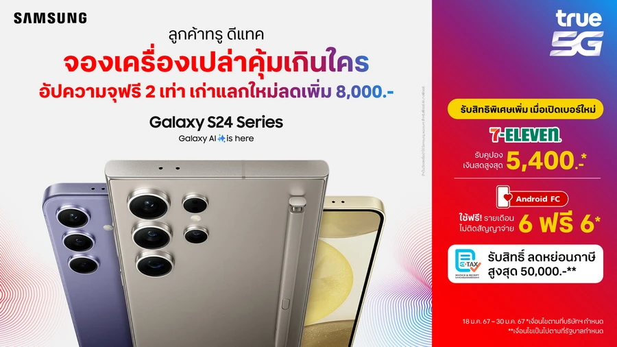 Galaxy AI is here...ทรู คอร์ปอเรชั่น ชวนวาร์ปสู่ยุคใหม่ไปกับ Samsung Galaxy S24 Series จัดเต็มความคุ้มค่าทั้ง เครื่องเก่าแลกใหม่ลดเพิ่มถึง 13,000 บาท* ผ่อนง่ายๆเริ่มต้นเพียงเดือนละ 403 บาทต่อเดือน กับบัตรเครดิตที่ร่วมรายการ หรือซื้อเครื่องเปล่า เพิ่มความจุฟรี 2 เท่า มูลค่า 10,000 บาท สำหรับเครื่องเก่าแลกเครื่องใหม่ลดเพิ่มอีก 8,000 บาท พร้อมรับสิทธิพิเศษอื่นๆ เมื่อเปิดเบอร์ใหม่รายเดือน นอกจากนี้ยังสามารถใช้รับสิทธิ์ลดหย่อนภาษี ได้ตามยอดซื้อจริงสูงสุด 50,000 บาท** พร้อมรับสิทธิพิเศษสุดคุ้ม ตั้งแต่วันนี้ถึง 30 มกราคม 2567