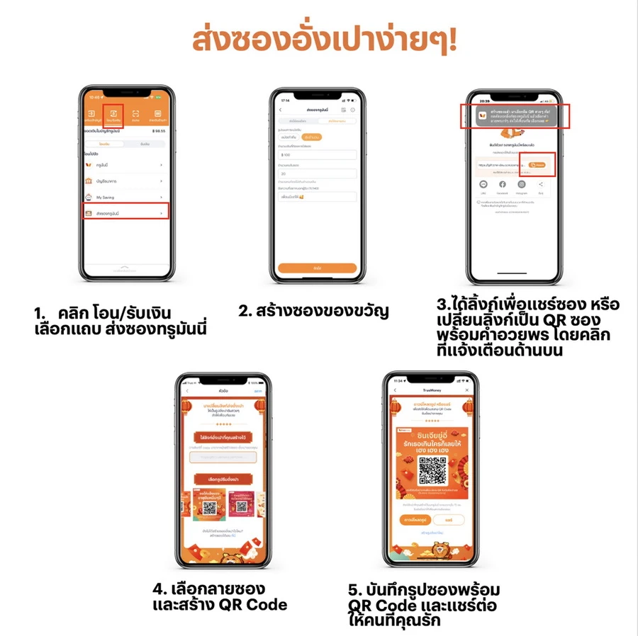 โดยในช่วงเทศกาลตรุษจีนรับปีมังกร 2567 สุดพิเศษนี้ ทรูมันนี่ ยังได้เตรียมซองลายมังกรน้อยน่ารักที่มาพร้อมคำอวยพรมหาเฮงโดนใจหลากหลายรูปแบบ เพื่อเพิ่มทางเลือกให้ผู้ที่ต้องการส่งอั่งเปาออนไลน์ ส่งให้ผู้รับสแกนคิวอาร์รับเงินได้ เพียงเอาลิงก์ซองที่สร้างแล้วไปกรอกในหน้า url link ที่ส่งไปทาง push notification และเลือกลายพร้อมคำอวยพรที่ต้องการ เพื่อบันทึกและนำไปแชร์ต่อได้ง่ายๆ