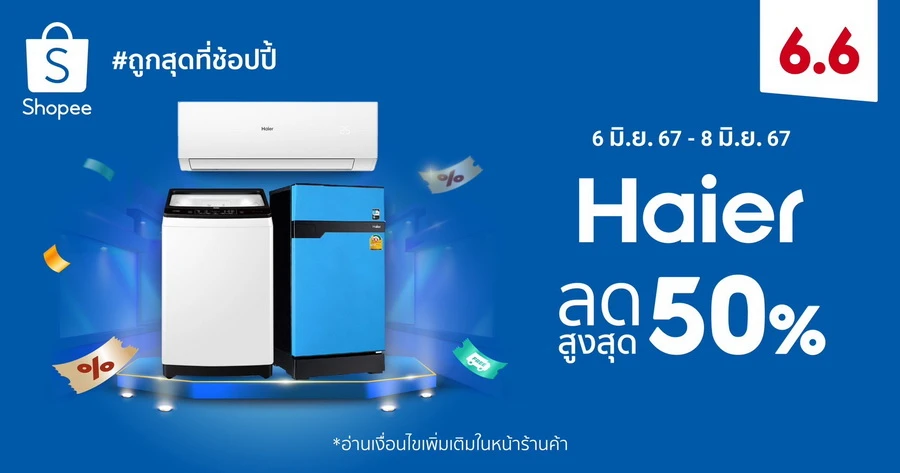 ไฮเออร์ (Haier) ผู้นำผลิตภัณฑ์เครื่องใช้ไฟฟ้าระดับโลกและแบรนด์เครื่องใช้ไฟฟ้าภายในบ้านอันดับหนึ่งของโลกติดต่อกัน 15 ปีซ้อน ร่วมกับ ช้อปปี้ แพลตฟอร์มอีคอมเมิร์ซเบอร์ 1 ครองใจนักช้อปชาวไทย เปิดโพยเครื่องใช้ไฟฟ้าพร้อมส่งโปรโมชั่นดับร้อน ใน Shopee 6.6 ลดใหญ่แบรนด์ดัง ด้วยส่วนลดสูงสุด 50% ครอบคลุมกว่า 50 รายการ ตั้งแต่วันที่ 3 - 8 มิถุนายน 2567