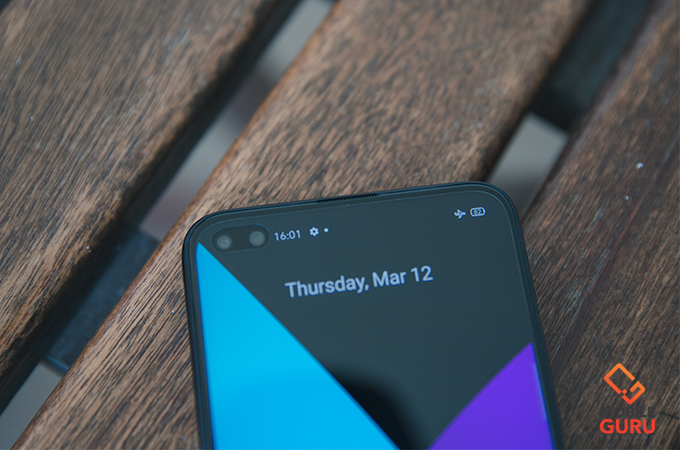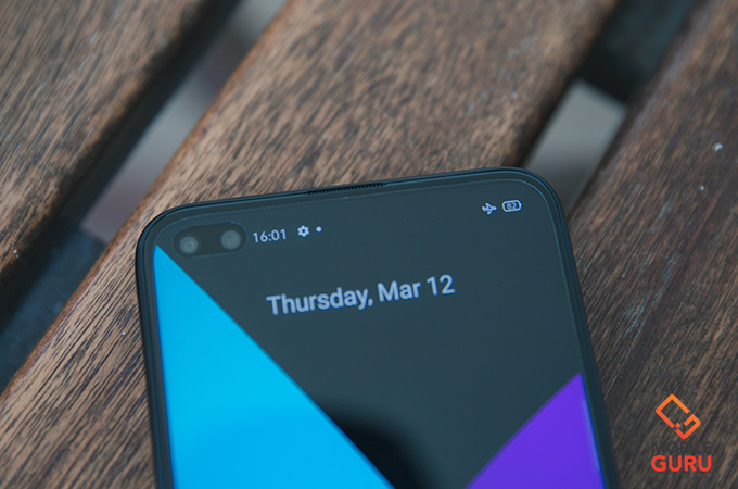 บริเวณรอยเจาะรูมุมซ้ายบนของหน้าจอ มีกล้องหน้าคู่ความละเอียด 16+8 ล้านพิกเซล ซึ่งเป็นกล้องเลนส์ Wide และ UltraWide