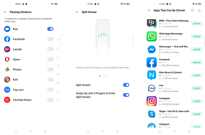 มีฟีเจอร์ Clone app, Split screen และ Floating windows (ไอคอนป็อปอัปบนจอ) เหมือนเดิม