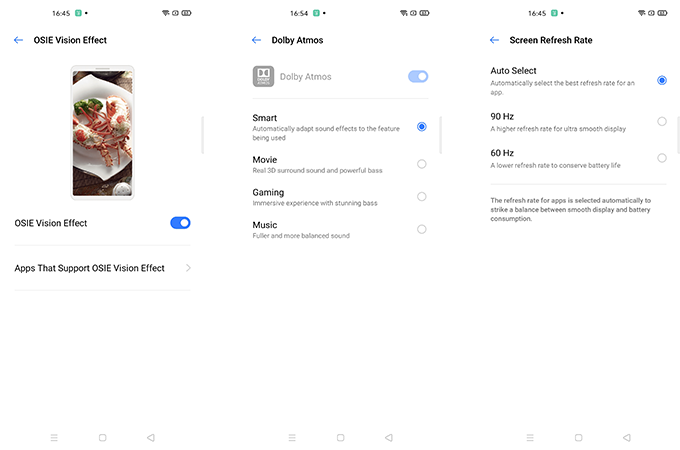 นอกจากนี้ realme ยังใส่ฟีเจอร์ใหม่ "OSIE Vision Effect" เป็นฟีเจอร์ที่จะใช้ AI ช่วยในการปรับแต่งภาพทั้งภาพนิ่ง และภาพวีดีโอที่กำลังแสดงผลอยู่บนหน้าจอให้สวยขึ้น โดยตัว AI จะทำการปรับเฉดสี แสง และคอนทราสของภาพที่แสดงอยู่ให้อัตโนมัติเมื่อเปิดโหมดนี้ ทำให้ได้อรรถรสในการชมภาพนั้นได้ดียิ่งขึ้น ถึงแม้ภาพนั้นจะไปเอามาจากนอกตัวเครื่องก็ตาม