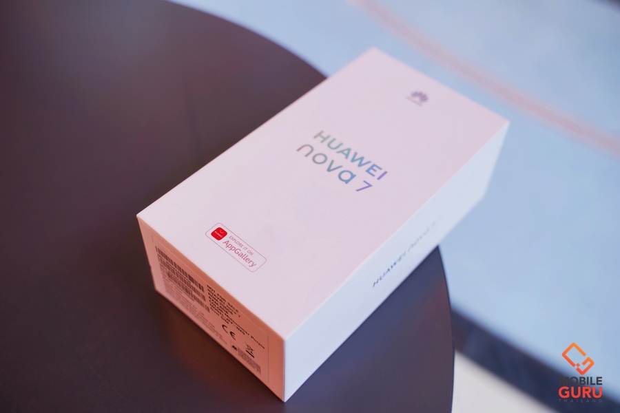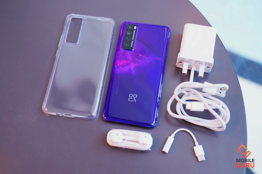 Huawei nova 7 อุปกรณ์ในกล่องจะมี ตัวเครื่อง, อะแดปเตอร์ พร้อมสาย USB Type-C, หูฟังแบบ Earbud, ตัวแปลง USB Type-C to 3.5 มม., เคสใส, (เข็มจิ้มซิม และคู่มือ จะมีในชุดวางจำหน่าย) มีดีไซน์ฝาหลังที่แตกต่างจากสมาร์ทโฟนทั่วไปในท้องตลาด มาพร้อมโลโก้ nova แบบใหม่ ที่สะท้อนให้เห้นถึงความเป็นตัวของตัวเอง และกล้าฉีกความเป็นไปได้อย่างสร้างสรรค์ สำหรับในรุ่นนี้ ทั้ง 3 สี ที่เป็นตัวเลือก ล้วนมีดีไซน์ที่แตกต่างกันอย่างสิ้นเชิงครับ สำหรับสีม่วง ที่ได้รับมารีวิว จะมีลวดลายเหมือนกับ Huawei nova 5T ที่ได้รับความนิยมอย่างสูงเมื่อปีที่แล้ว มีการออกแบบเลเยอร์ฝาหลังได้อย่างน่าสนใจ และดูสนุกสนานมากๆ