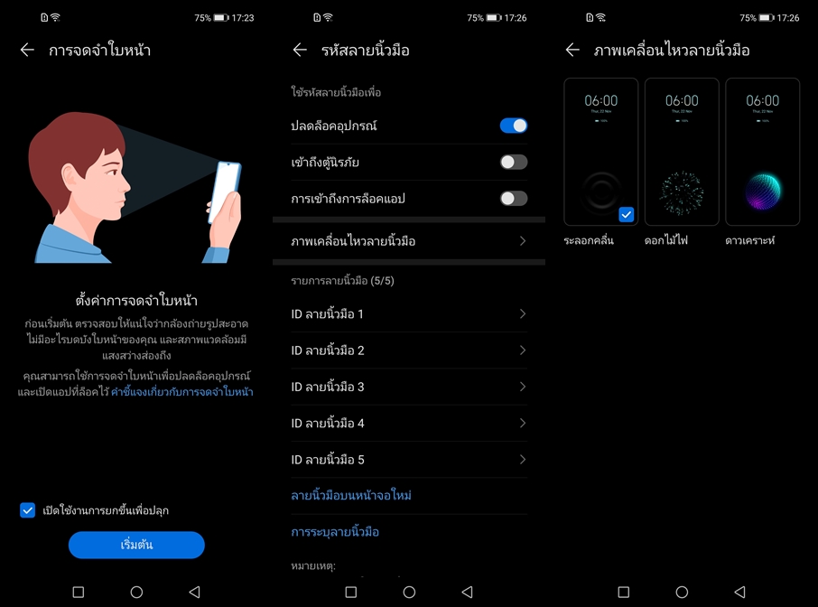 Huawei nova 7 รองรับ Face Access และการสแกนลายนิ้วมือใต้หน้าจอ รองรับสุงสุด 5 ลายนิ้วมือ ความแม่นยำ และความรวดเร็วทำได้ดีมาก นอกจากนี้ยังสามารถปรับแต่งเอฟเฟกต์ได้ 3 รูปแบบด้วยครับ