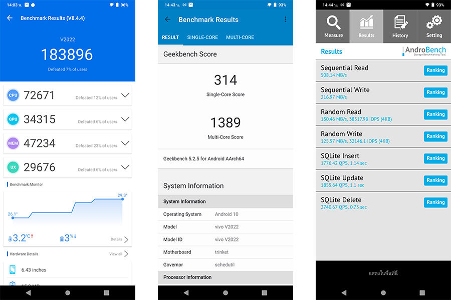 - ทดสอบประสิทธิภาพการเขียน-อ่าน หน่วยความจำ (ROM, UFS 2.1) ได้ค่าการอ่าน 508.14 MB/s และค่าการเขียน 216.97 MB/s