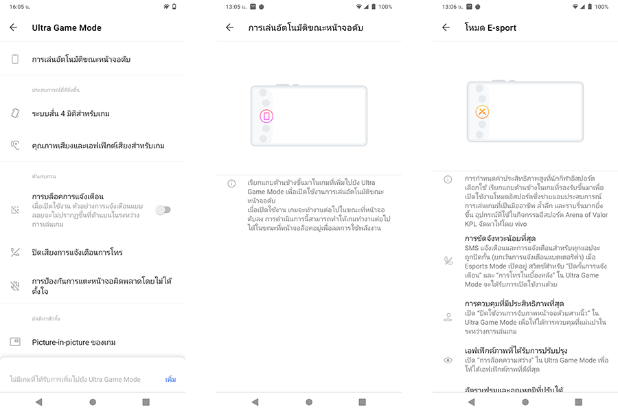 นอกจากนี้มี Ultra Game Mode โหมดสำหรับเล่นเกมโดยเฉพาะติดตั้งมาให้บนเครื่องมาให้ด้วย โดยภายในโหมดนี้จะมีฟังก์ชันที่เกี่ยวกับการจัดการทรัพยากรบนตัวเครื่องต่างๆ ที่เราสามารถหรือปรับแต่งให้เหมาะกับการเล่นเกมของเราได้ด้วย เช่น การปิดการแจ้งเตือนขณะเล่นเกม, การเปิดโหมดสั่น 4 มิติ ซึ่งตัวเครื่องจะมีการสั่นแบบ Haptic ให้ขณะเล่นเกม เพื่อเพิ่มอรรถรสในการเล่นเกมให้มีอินเนอร์มากขึ้น หรือจะเป็นโหมด E-sport โหมดจัดการสำเร็จรูปที่จะเลือกปรับค่าต่างๆ ของตัวเครื่องให้เหมาะกับการเล่นเกมให้อัตโนมัติ เป็นต้น ซึ่งช่วยอำนวยความสะดวกในการเล่นเกมได้ดีเลยนะ ผมว่าใครที่ชอบเล่นเกมน่าจะถูกใจกัน ถึงแม้จะไม่ใช่ของใหม่บนสมาร์ทโฟน แต่วีโว่ก็เข้าใจที่ใส่ลูกเล่นต่างๆ มาให้เหมาะกับคนเล่นเกมได้ดีเลย อยากให้ลองเข้ามาใช้กันดู