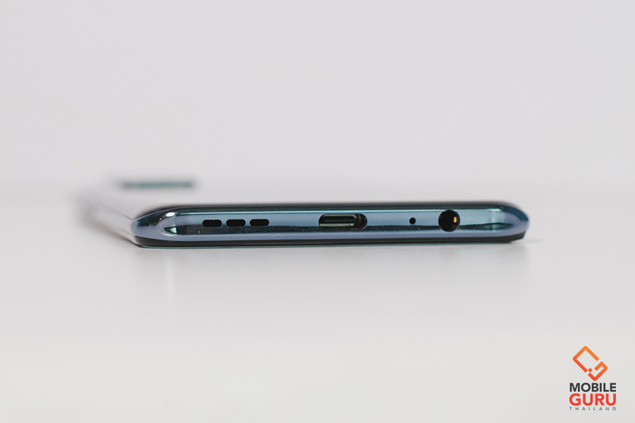 ด้านล่างตัวเครื่อง มีลำโพงเสียงตัวเครื่อง, พอร์ต USB-C และรูเสียบชุดหูฟังขนาด 3.5 มิลลิเมตร